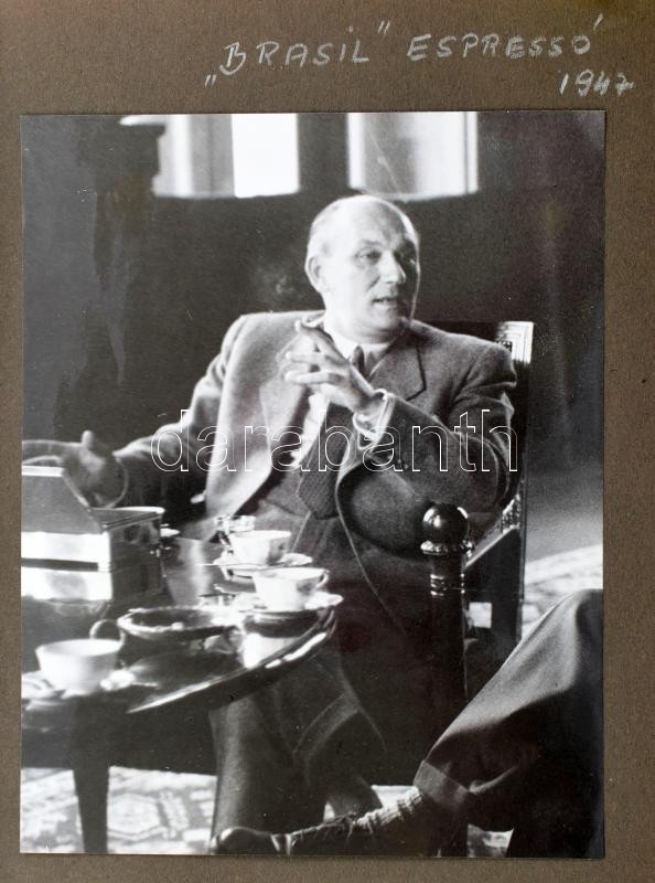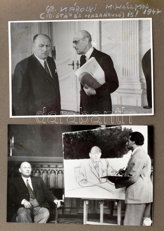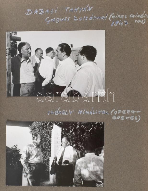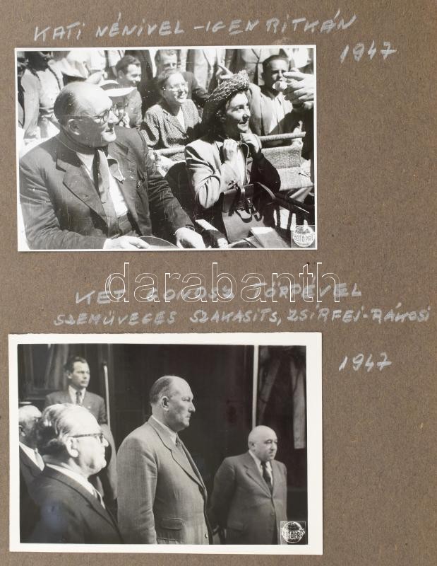 1947-1948 Dinnyés Lajos (1901-1961) kisgazda politikus, miniszterelnök fotóalbuma, benne Károlyi Mihály, Rákosi Mátyás, Vas Zoltán, Mihályfi Ernő, Dobi István, Nagy Imre, Szakasits Árpád, Gerő Ernő, Rajk László, Kádár János politikusok, valamint Székely Mihály operaénekes, .... és mások. De benne pár 1950 kr. fotóval is. 54 családtag által feliratozott fotó, hasított bőr-kötéses fotómappában, változó méretben, jó állapotban.