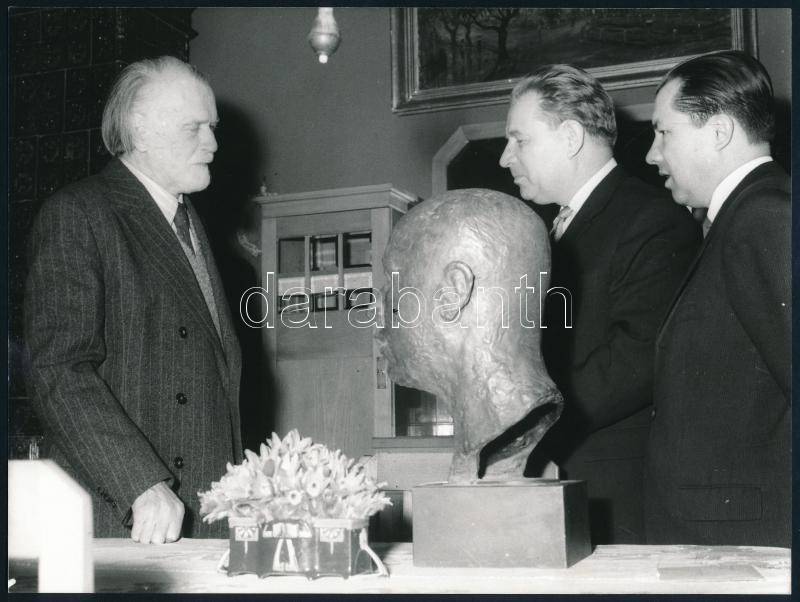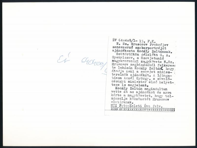 1964 április 9. Kodály Zoltán zeneszerző a szovjet nagykövettől vette át Hruscsov ajándékát, amely Prokofjev zeneszerző szoborportréja volt, feliratozott sajtófotó, 18x24 cm