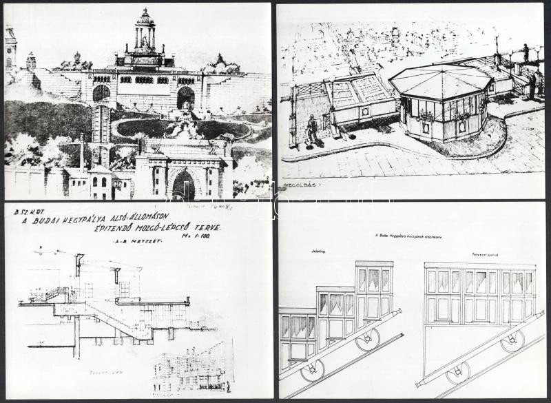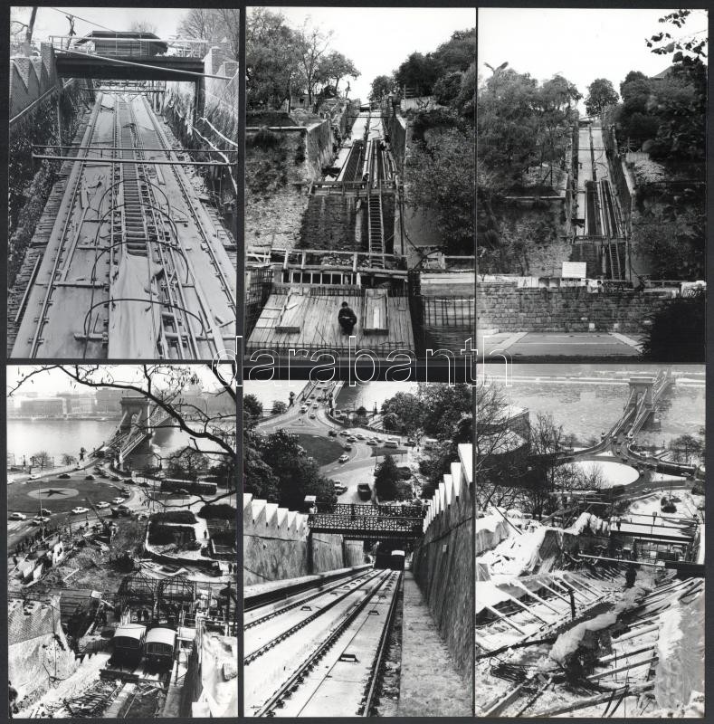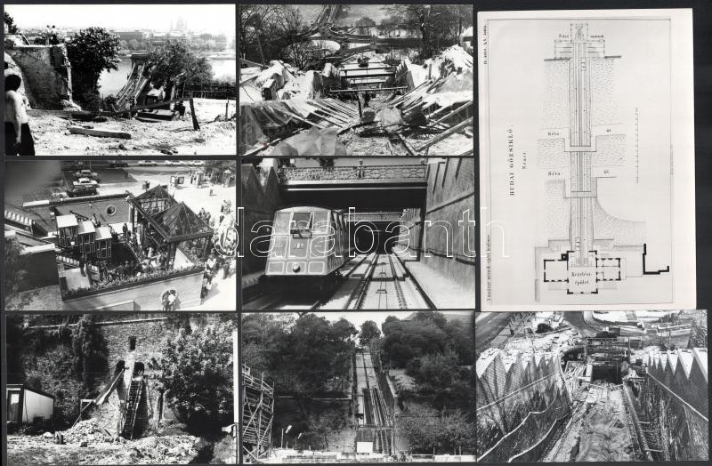 1985-1986 Budapest, a budai sikló építéséről készült felvételek, 13 db vintage fotó datálva, pecséttel jelezve, + hozzáadva 5 db reprodukciót (tervrajzok a budai gőzsiklóról, később budai hegypályáról), ezüst zselatinos fotópapíron, 9x14 cm és 13x18 cm