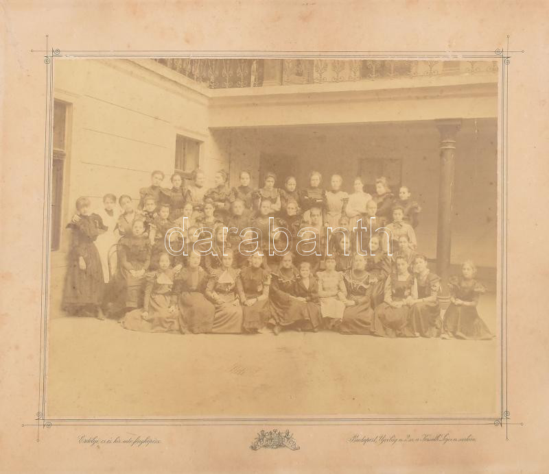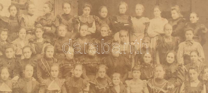 cca 1900 Országos Nőképző-Egyesület Veres Pálné Leányiskolájának Tanítóképezdei csoportjának tablófotója, Erdélyi (Mór) cs. és kir. udvari fényképész budapesti műterméből, fotó kartonon, körbevágott, a hátoldalon a csoporttagok aláírásaival.