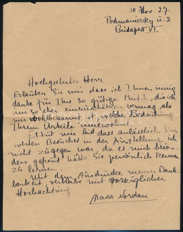 1927.XI.27.Bp. Maxa Nordau (1897-1993) francia-zsidó festőművész levele Gerő Ödön (1863-1939) művészeti író, a Pester Lloyd belső munkatársának, amelyben megköszöni neki a kiállításáról írt kritikát. Maxa Nordau Max Simon Nordau, eredeti nevén Südfeld Simon Miksa (1849-1923) orvos, újságíró, cionista lánya volt, 1927 novemberében-decemberében több héten keresztül Budapesten tartózkodott. Maxa Nordau autográf aláírásaival, egy kézzel írt oldal német nyelven, eredeti borítékban.