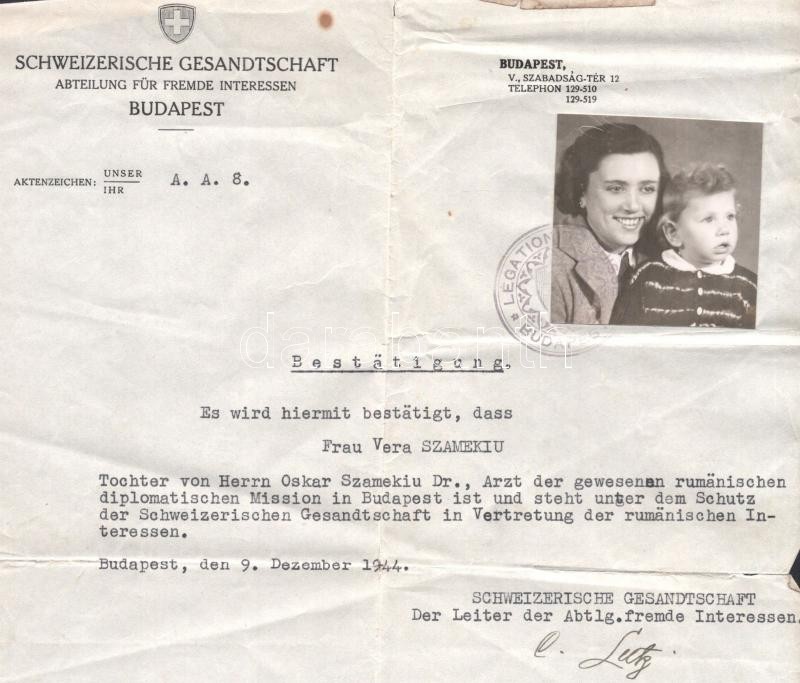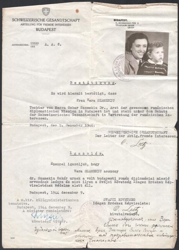 1944 A svájci követség menlevele (Schutzpass) Oskar Szamekiu a volt román diplomáciaimisszió feleségének részére, mentesítő igazolás Lutz követségi titkár aláírásával.és szovjet feljegyzésekkel. Szakadásokkal. / 1944 Schutzpass of the Swissconsulat for the wife of Mr. Samekiu doctor of the ex Romanian diplomatic mission.Tears
