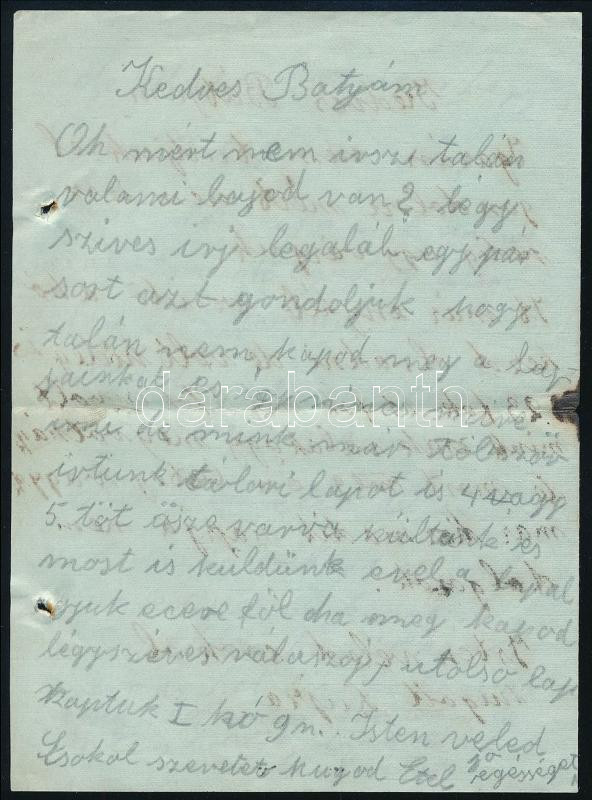 Leírás: 1916-1917 a M. kir. Erdélyi Portyázó Zászlóalj igazolása és levél a zászlóalj egyik katonájához tartalommal, "Eltűnt, Vissza a feladónak" bélyegzéssel