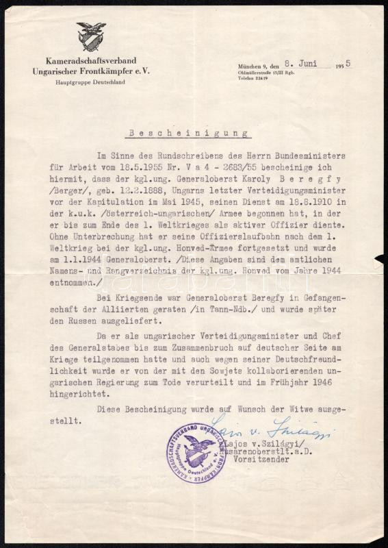 1955 Beregfy Károly (1888-1946), a Szálasi kormány később kivégzett hadügyminisztere életéről és érdemeiről kiadott igazolása a Magyar Frontharcosok Bajtársi Egyesületének (Kameradschaftsverband Ungarischer Frontkämpfer e V. Az igazolást felesége kérésére állították ki. Szilágyi Lajos huszártábornok aláírásával