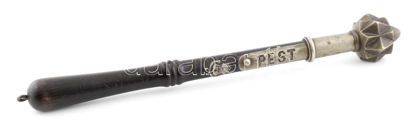 cca 1860 Konstábler bot. Rendőr bot. Az 1848-ben megalapított majd 1861-ben újjáalakult pesti rendőrség hatalmi jelképe, rajta Pest 1848 felirattal, és Pest város címerével. Fém, fa, egy címer hiányzik. / Constable stick of a Hungarian policeman. One sign missing. 28 cm