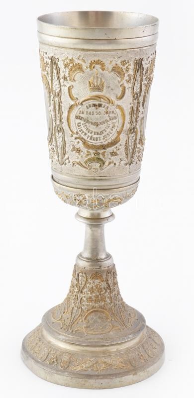 1898 Eduard Mahner: Ferenc József uralkodásának 50. jubileumára készült ón kupa, aranyozott kissé deformált talppal 25 cm / Emperor Franz Joseph I. 50th anniversary tin coup with minor deformation 25 cm