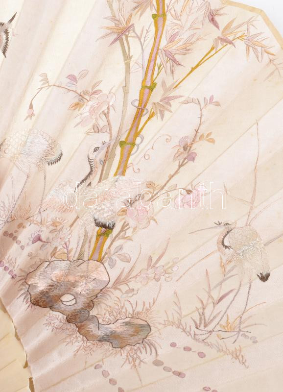 Kínai legyező. nagy méretű, faragott csont és kézzel festett selyem. Egyedi, kézzel festett, lakkozott, selyem bélésű dobozban. 33 cm Üveg lappal. Doboz mérete 41x8x7 cm / Large Chinese fan. Ebony, hand painted silk