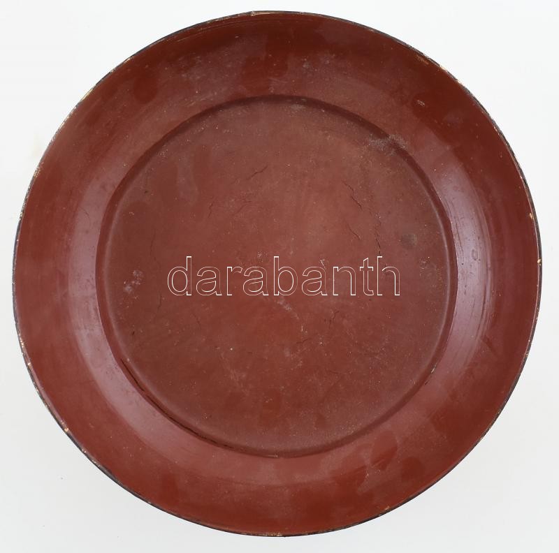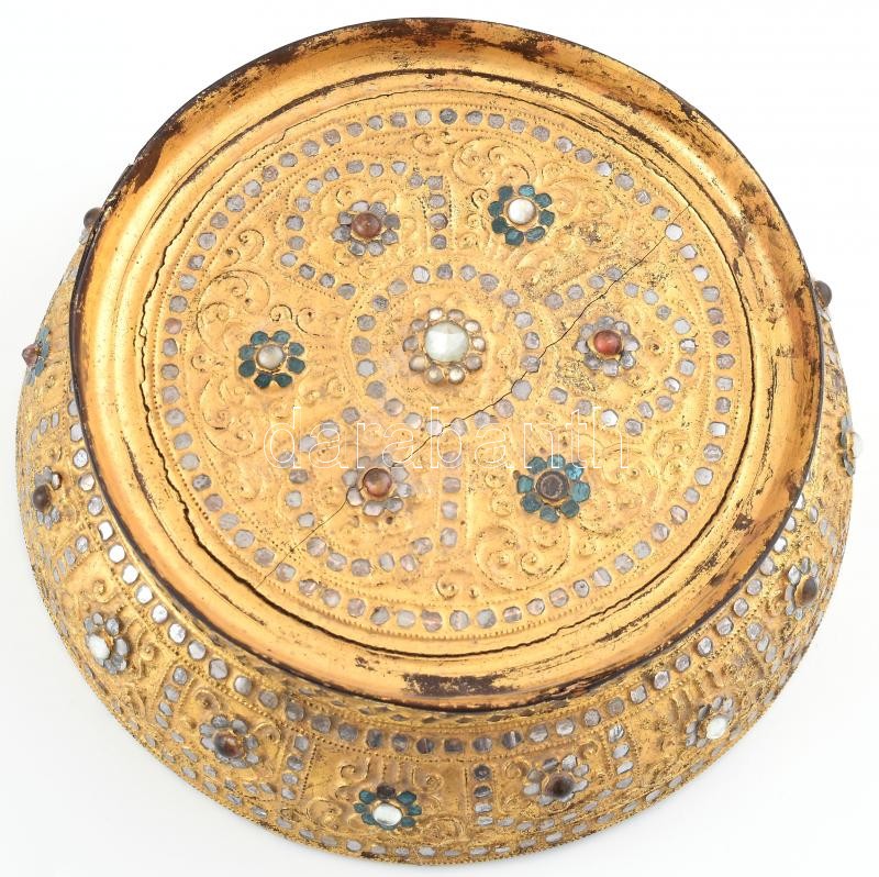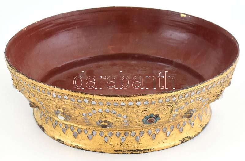 Leírás: Lakkozott fa tálka. XIX. sz. India. Üveggyöngyökkel, kézzel festett, laparonyozott, kopott, repedésekkel. d: 26 cm