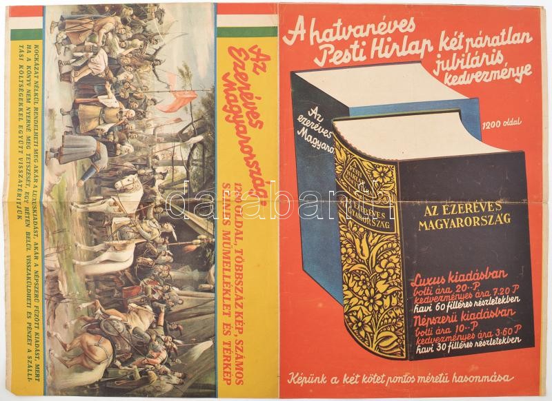 1939 Az ezeréves Magyarország - a hatvanéves Pesti Hírlap nagyméretű, kihajtható reklámkiadványa, Munkácsy Mihály Honfoglalás c. festményének képével illusztrálva. Bp., Légrády-ny., (4) p. Hajtásnyomokkal, apró lapszéli szakadásokkal, teljes méret: 57,5x41 cm
