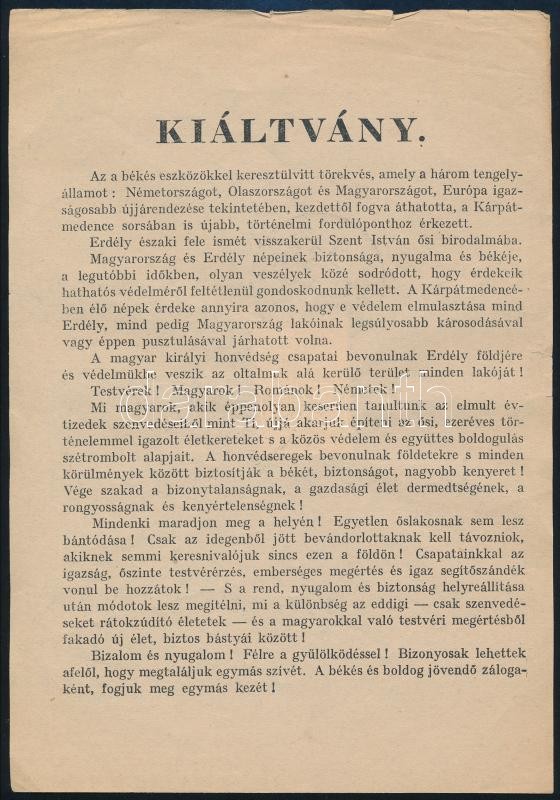 1940 Erdélyi bevonulás alkalmából kiadott röplap, hátoldalán visszatér... https://www.darabanth.com/hu/39-Nagyaukcio/39.1/Mutargy-szobor-papirregiseg/Nyomtatvanyok~16044/1940-Erdelyi-bevonulas-alkalmabol-kiadott-roplap-hatoldalan-visszatert-belyegzovel~II2710330