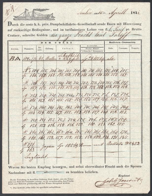1841 Hajós fuvarlevél Pestre Erős hajó / Erős ship bill of freight https://www.darabanth.com/hu/39-Nagyaukcio/39.1/Mutargy-szobor-papirregiseg/Okmanyok~16377/1841-Hajos-fuvarlevel-Pestre-Eros-hajo-Eros-ship-bill-of-freight~II2725566
