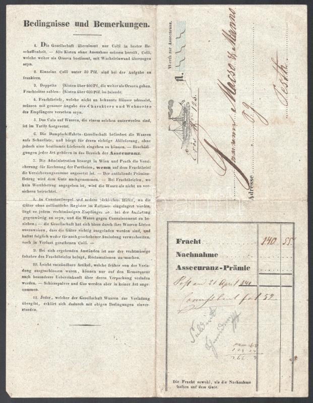 Leírás: 1841 Hajós fuvarlevél Pestre Erős hajó / Erős ship bill of freight