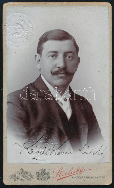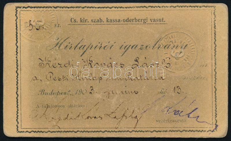1903 Kézdi-Kovács László (1864-1942) festőművész, műkritikus, a Pesti Hírlap munkatársa fényképes igazolványa a Cs. K. Szab. Kassa-Oderbergi Vasútra, autográf aláírásával, kissé kopott