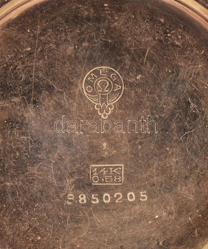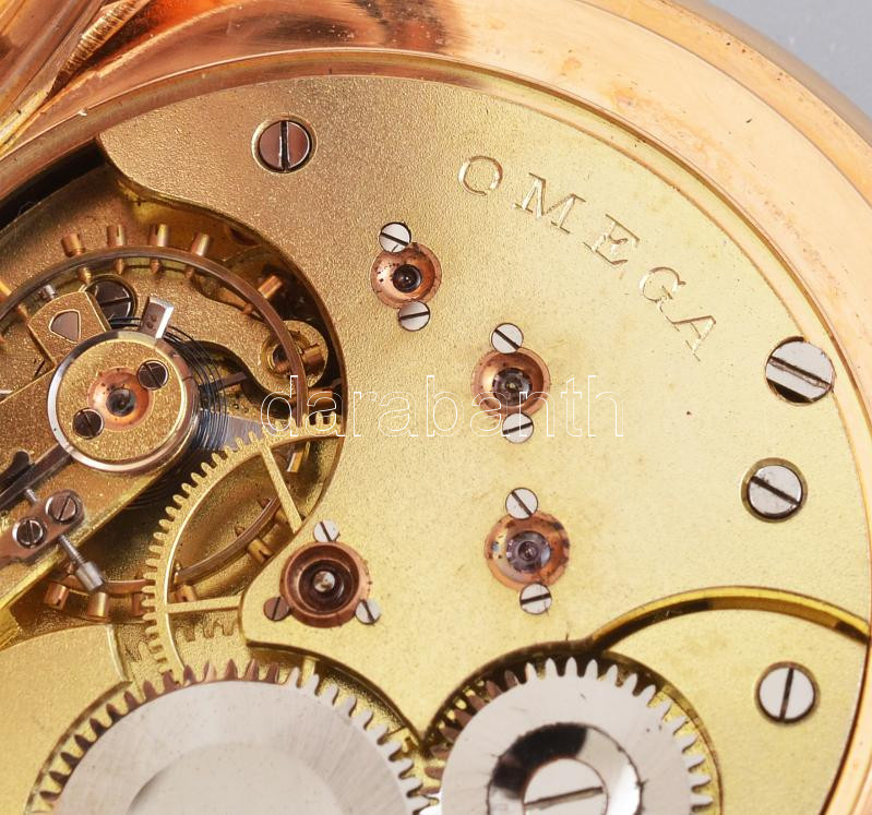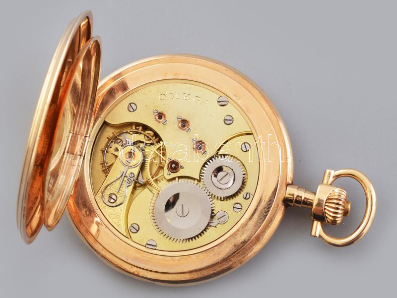Omega 14K arany (au) zsebóra, dupla arany tokos. Szép állapotban, jelzett, hibátlan számlappal, működőképes, egy minimális horpadással. d: 50 mm, br 77,6 g