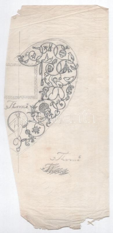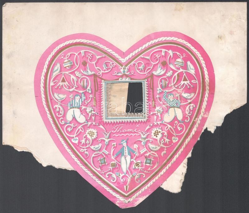 Thomé art deco, szív alakú csokoládé reklámos, illusztrált termékcsomagolás és annak ceruzával rajzolt terve, 1930 körül. Termékcsomagolás kartonra kasírozva, kissé sérült. Terv: Ceruza, papír, vágott, kissé sérült Jelzés nélkül, feltehetően Galambos Margit grafikája. 18x18 cm és 28,5x13,5