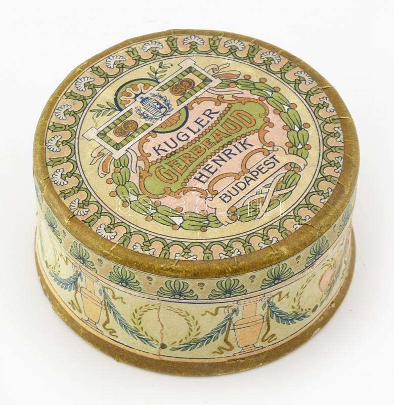 Leírás: cca 1910 Kugler Henrik Gerbeaud bonbonos doboz, alumínium, papír borítással, szecessziós, szép állapotban, d: 7,5 cm
