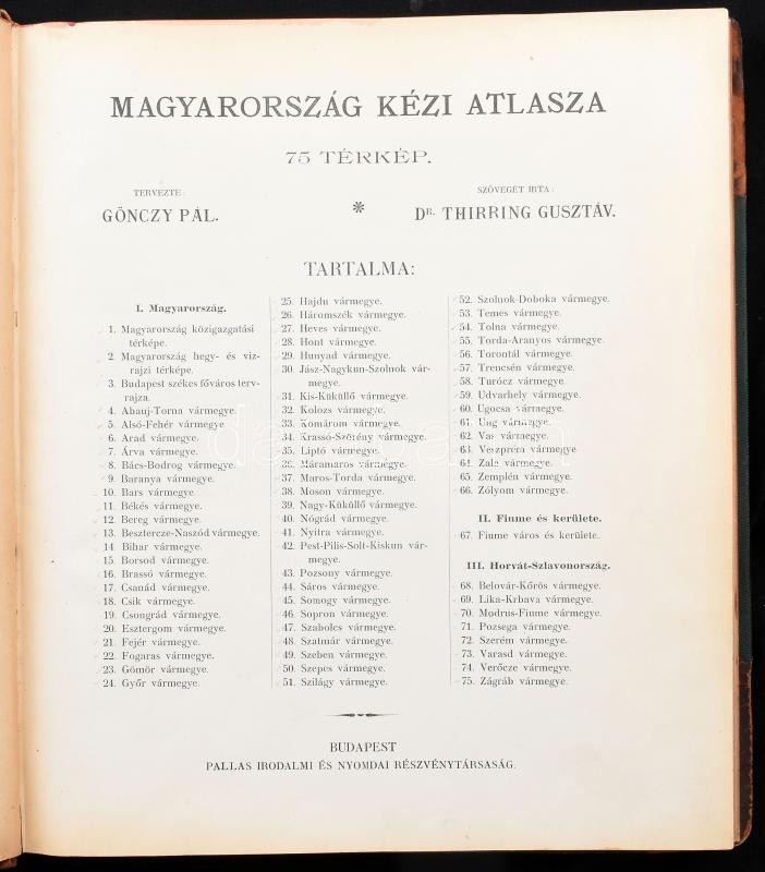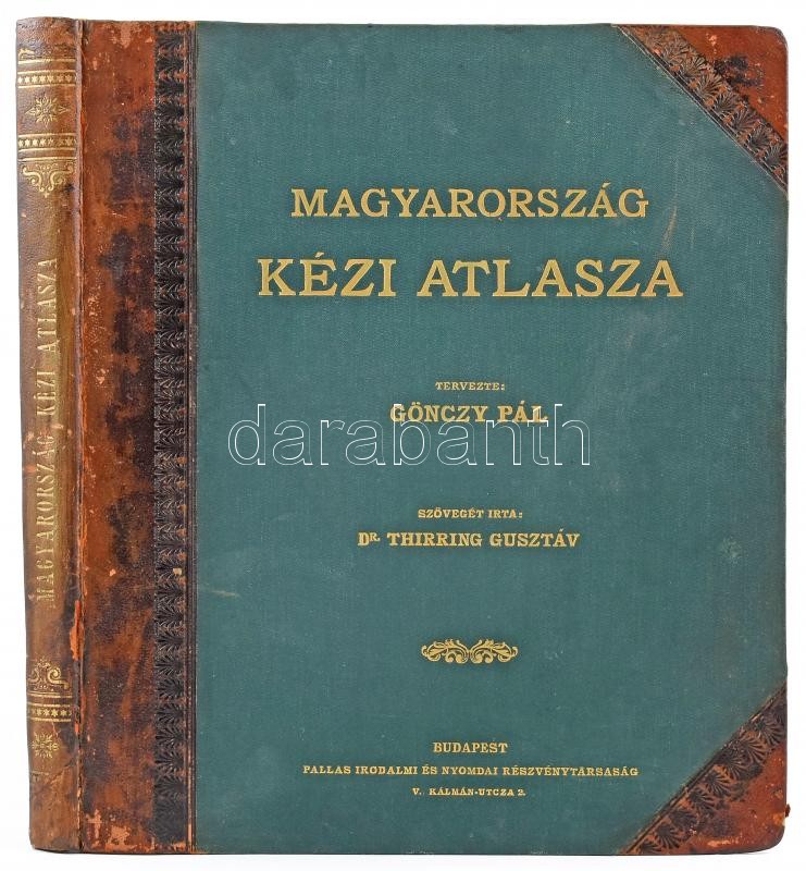 1897 Magyarország kézi atlasza. 75 térkép. Tervezte: Gönczy Pál. Szövegét írta: Dr. Thirring Gusztáv. Bp., [1897], Pallas, 21 p. + 75 t. Kiadói aranyozott félbőr-kötésben, kissé sérült, kopott borítóval és gerinccel, a szennylapokon sérülésekkel, a térképek jó állapotban.