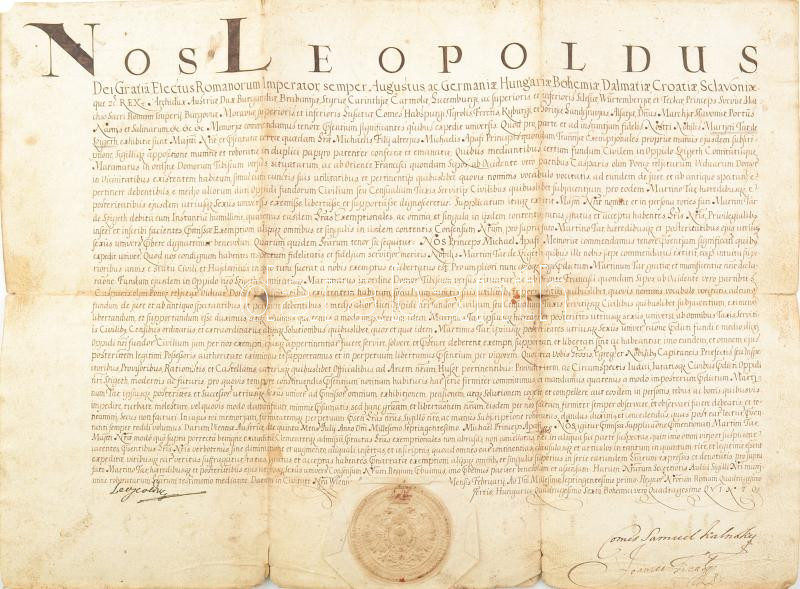 1701 I. Lipót szigeti Tar Márton kérésére teljes szövegében átírja és megerősíti II. Apafi Mihály oklevelét, amelyben Tar Márton máramarosszigeti birtokára adómentességet adományoz. Latin nyelvű oklevél. Papír, a hajtások mentén kisebb sérülésekkel, felzetes rányomott viaszpecséttel, Lipót aláírásával valamint Kálnoky Sámuel erdélyi alkancellár és Fiáth János erdélyi kancelláriai tanácsos ellenjegyzésével. 1701 Leopold I Holy Roman Emperor and King of Hungary transcribes in full and confirms - upon the request of Márton Tar de Sziget - a previous charter issued by Michael II Apafi, granting Márton Tar tax exemption on his property in Máramarossziget (now Sighetu Marmaţiei, RO). In Latin, on paper with minor damages along the folding lines. With vax seal, with the signature of Leopold I and the countersignatures of Sámuel Kálnoky, Vice-Chancellor of the Transylvanian Chancellery and János Fiáth, Councillor of the Transylvanian Chancellery. 52x37 cm