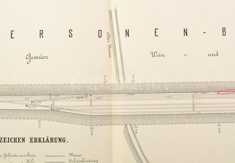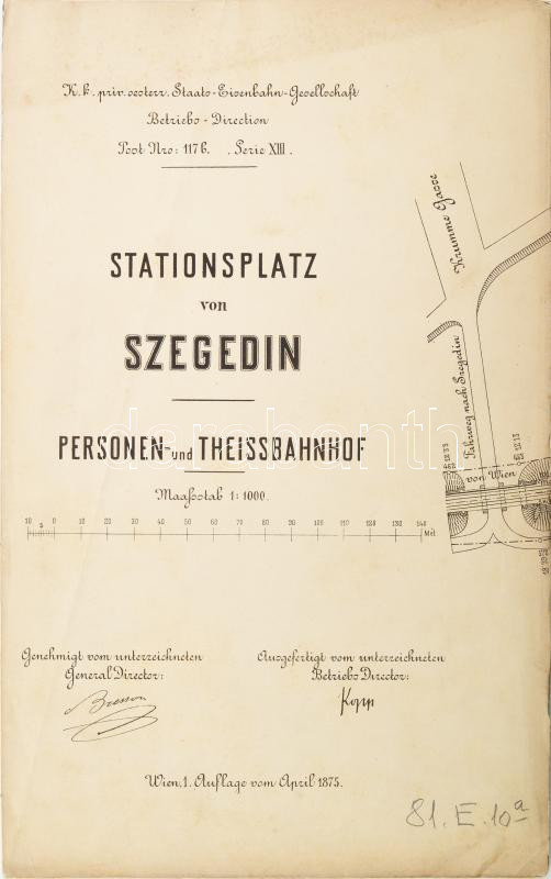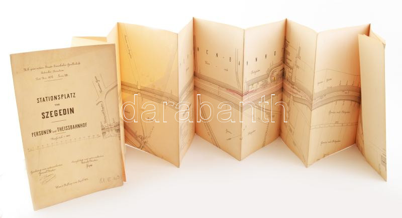 1875 Szegedi Személyi és Tiszai pályaudvar terének nagyméretű térképe (Stationsplatz von Szegedin, Personen- und Theissbahnhof). Bécs, 1. kiadás, 1875 április. K.k. priv. oesterr. Staats-Eisenbahn-Gesellschaft Betriebs-direktion. Sokszorosított térkép, néhány kézzel színezett-jelölt részlettel. Német nyelvű feliratokkal. 1:1000, 68x218 cm. Lapszéli apró sérüléssel, helyenként kissé foltos, korához képest jó állapotban.