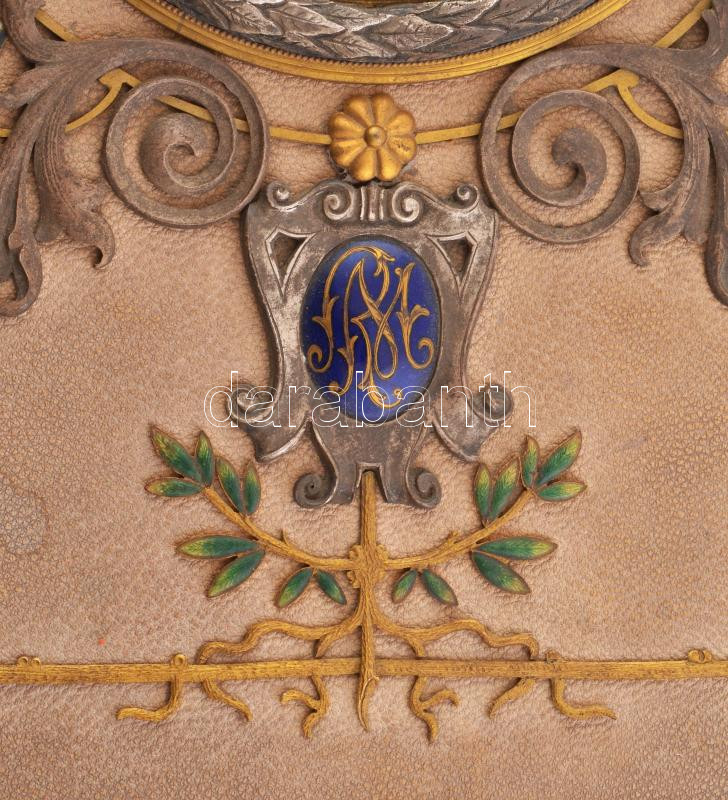 1907 Zólyom megyei tisztviselÅ‘k, közéleti személyiségek, a Magyarországi Kárpát Egyesület vezetÅ‘i emlékalbuma. 64 db nevesÃtett kabinetfotó, dÃszes, nagy méretű, zománcberakásos, Zólyom vármegye cÃmerével dÃszÃtett, festett albumban. Osztroluczky Béla fÅ‘ispán, Battik Ödön megyei fÅ‘jegyzÅ‘, Ferenczy Ödön (1866-1948) megyei aljegyzÅ‘, késÅ‘bb vármegyei fÅ‘jegyzÅ‘, Puschmann Edgár, Kostyalik Ferenc, Burkovszky Kálmán, Samassa Tivadar, Lazarovich Károly, Csesznák Gyula Besztercebánya polgármestere, Skrovina Mátyás országgyűlési képviselÅ‘, Svehla. János vármegyei tb. fÅ‘orvos, Zsembery Gyula (1877-1957) takarékpénztári ügyész, Magyar Turista Szövetség alelnöke. Kollár Kamilló a beszterbányai városi kórház utolsó magyar fÅ‘orvosa és még sok más orvos, tiszt, polgármester, jegyzÅ‘, stb. Aranyopzott lapszélekkel, lejáró réz kapoccsal, gerincén kis szakadással, de összességében szép állapotban 42x37 cm / 1897-1907 Large photo album of Zólyom county. (Zvolen, SK). 64 cabinet photos of the leaders and officials of the county from doctors, to polticians to members of the Hungarian Carpathian Assoiation. mayors, notaries. In beautiful leather album with enameled copper onlay, with enameled coat of arms of the county. 43x37 cm With minor damage on the the spine, copper clasp needs to put back but in general good condition