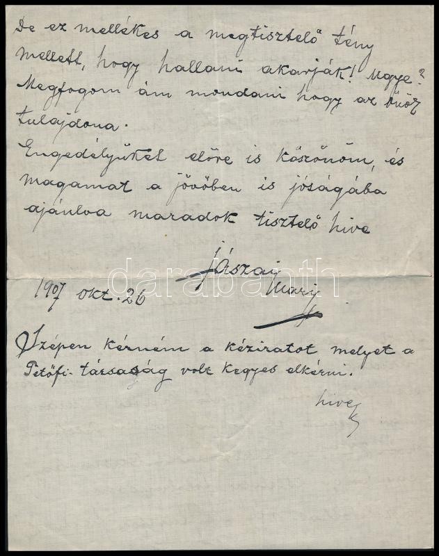 1907.okt. 26 Jászai Mari (1850-1926) színésznő autográf levele Gerő Ödön (1863-1939) művészeti újságíró, szerkesztőnek, Pesti Napló munkatársának, amelyben Petőfi témában ír. 1907-ben jelent meg a Petőfi-Album a Pesti Napló kiadásában, amelyben Jászai Mari is jegyzett egy fejezetet "Petőfi s a szinészet" címmel, a tanulmánya végén Szováta, 1907 július 24-én helymeghatározással és datálással: (...) Mikor Ön nekem Szovátára lélekemelő és mindenek fölött jutalmazó levelét megírta, - melyet rebegő bizonytalan érzések közt, oh mennyire vártam! - akkor azt írta, hogy Petőfiről,-szép-szép, jó-jó amit írnak, de valósággal, öt könyvet kellene írni ma! - Ez a levele még a kezemben volt, mikor a Csókfalván tartott unitárius nagy gyűlésről megjövet, Ürmössy Miklós barátom bemutat nekem egy magával hozott fiatal férfit, ezekkel a szavakkal: Barabás Ábel, aki Petőfiről öt könyvet írt(...) nézze el ha én a kis Petőfimet nov. 2ikán a Lipótvárosi Casinóban egy hölgy estélyen fölolvasom. Fölszólítottak rá és fényesen fizetnek! (...) Szépen kérném a kéziratot, melyet a Petőfi-társaság volt kegyes elkérni". Három és fél beírt oldal, Jászai Mari autográf aláírásával.