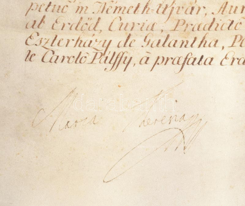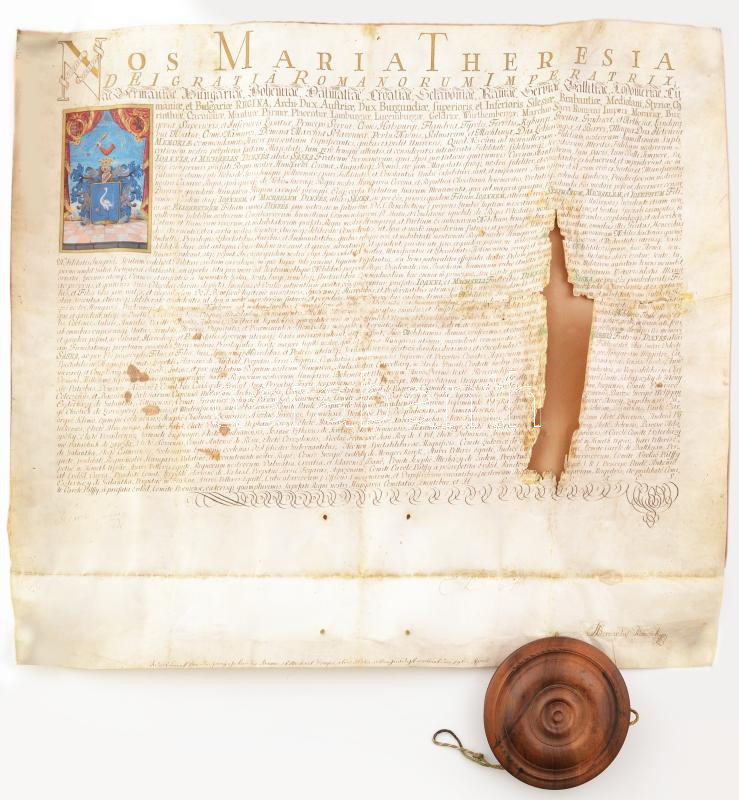 VÉDETT!!! 1750 A Dinnyés család címereslevele (armalis) Mária Terézia autográf aláírásával Sérült, sérült függő viaszpecséttel. Dinnyés Lajos miniszterelnök hagyatékából 62x88 cm / Armalis for the Dinnyés family signed by Maria Theresia Emperor, damaged.