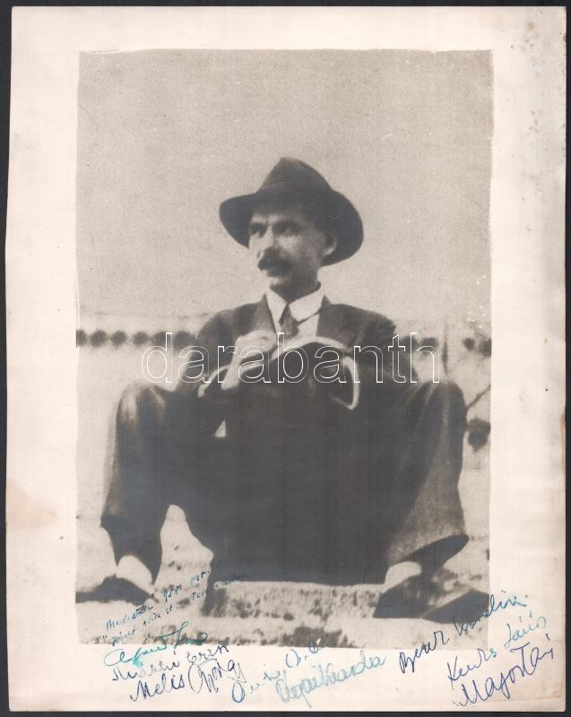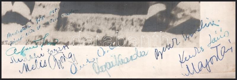 cca 1934 József Attila (1905-1937) költő a Duna-part lépcsőjén, ez alapján készült a szobor is, jelzés nélküli fotó, a felületén kis folttal. 30x24 cm. Rajta a Medvetánc c. József Attila televíziós műsor (1958. okt. 2.) előadóinak aláírásával, rajta Máthé Erzsi, Melis György, Ágai Karola, Berek Katalin, Major Tamás, és mások aláírásaival.