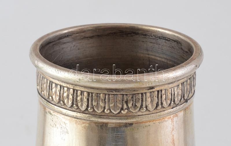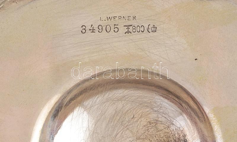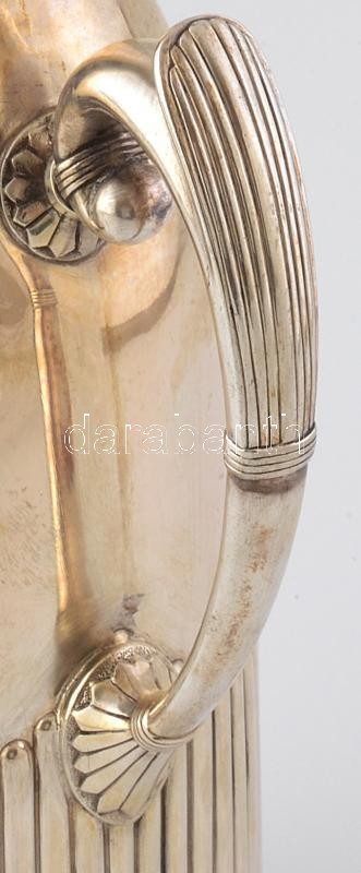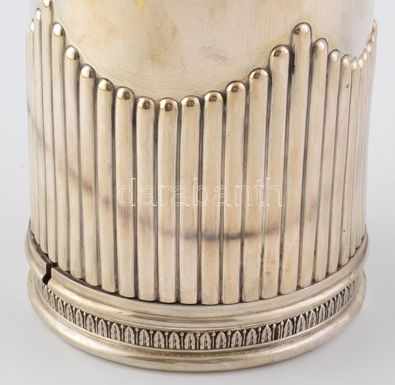 Ezüst (Ag) Jugendstil bortartó. Lecsavarható, bajonettzáras kerek bortartón barázdált díszítésű füles palack, oldalán rozettákban végződő csigavonalas füllel. Peremein reliefszerűen körbefutó, vésett lándzsaleveles díszítmény. Jelzett: Bréma, 800-as fémfinomsági jellel, valamint 34905-ös beütött formaszámmal és L. Werner mesterjegyével. Német, 1900 körül, Koch & Bergfeld ezüstgyára. M.: 30 cm, nettó: 933 g. / Art nouveau wine flask. Openable bayonet-lock holder, richly decorated. Bremen, Germany, ca 1900. Koch & Bergfeld Silver Factory. 30 cm, 933 g