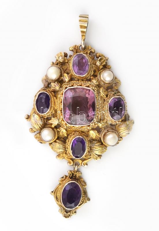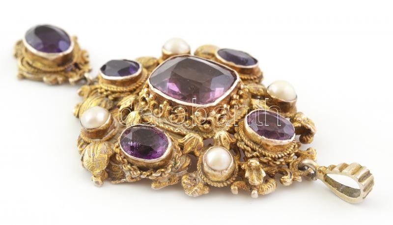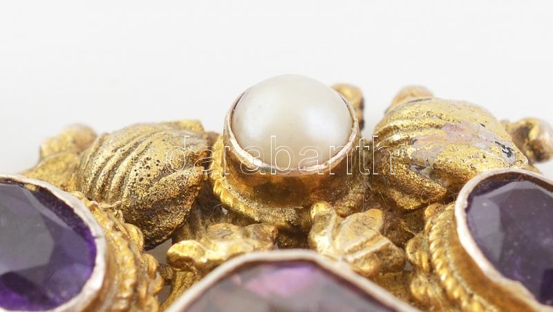 Leírás: Ezüst (Ag) melltű függő, 6db ametiszttel és tenyésztett gyöngyökkel ékítve, jelzés nélkül, 7,5x4,5cm, bruttó: 29g