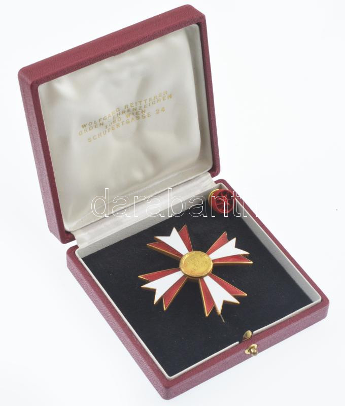 Ausztria 1955. "Tudományokért és Művészetekért Érdemkereszt" aranyozott, zománcozott bronz kitüntetés, rozettával, eredeti tokban, "W. Reitterer - 1090 Wien - Schubertgasse 24" gyártói jelzéssel T:1- Austria 1955. "Merit Cross for Arts and Letters" gilt, enamelled bronze decoration with rosette, in original case, with "W. Reitterer - 1090 Wien - Schubertgasse 24" maker's mark C:AU