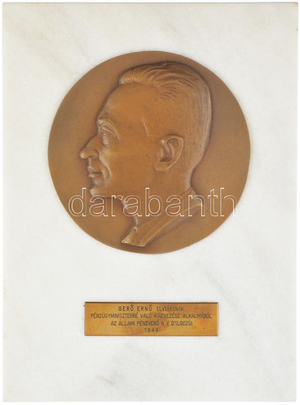 1949. "Gerő Ernő elvtársnak pénzügyminiszterré való kinevezése alkalmából - Az Állami Pénzverő N.V. dolgozói - 1949" feliratú bronz plakett (100x25mm) Gerő Ernőt ábrázoló bronz emlékéremmel (150mm) együtt márványlapra rögzítve (220x300x20mm) T:1 nagyméretű, törékeny tárgy. Személyes átvétel javasolt! / Hungary 1949. Bronze plaque with the inscription "On the occasion of the appointment of Comrade Ernő Gerő as Minister of Finance - Employees of the National Mint N.V. - 1949" (100x25mm) together with a bronze commemorative medal depicting Ernő Gerő (150mm) mounted on a marble slab (220x300x20mm) C:UNC large, fragile object. Personal takeover is recommended!