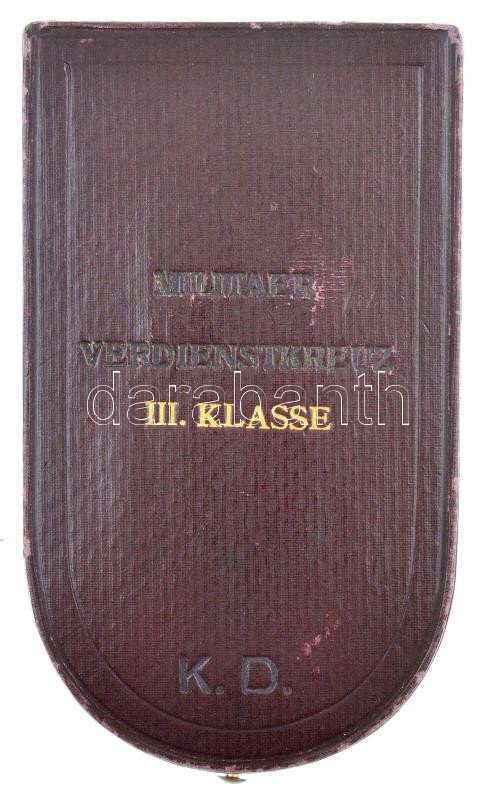 1916. "A Katonai Érdemkereszt III. Osztálya hadidíszítménnyel és kardokkal" fülön jelzett, zománcozott Ag kitüntetés mellszalagon, eredeti "Rothe & Neffe" adományozói tokban T:1,1- / Hungary 1916. "Military Merit Cross, 3rd Class with war decoration" enamelled Ag decoration on ribbon, hallmarked on the ring, in original "Rothe & Neffe" case C:UNC,AU