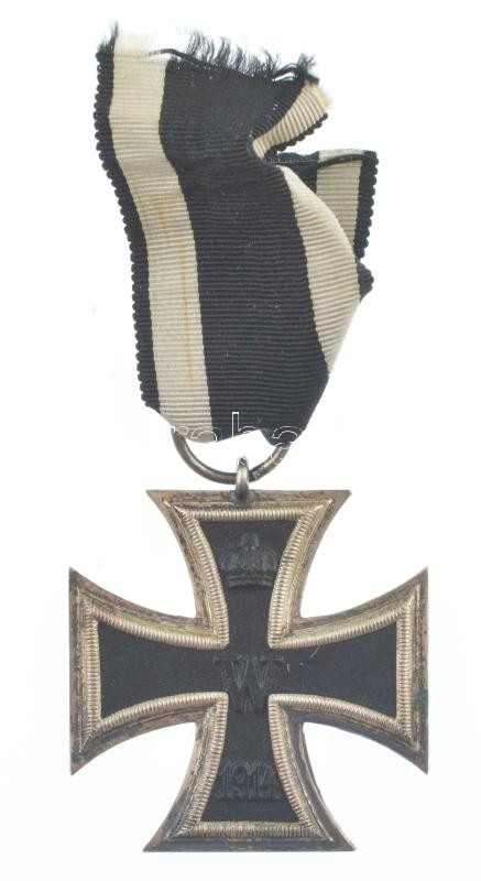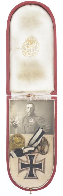 Német Birodalom 1914. "Vaskereszt 2. osztály" kitüntetés mellszalaggal, "Rothe & Neffe Wien" tokban, ismeretlen katona fényképével és két darab, a tokba rögzített sapkajelvénnyel "1914 Weltkrieg 1915 - Mit vereinter kraft Heeresgruppe Mackensen" bronz sapkajelvény T:1,2 / German Empire 1914. "Iron Cross 2nd class" decoration with ribbon, in a "Rothe & Neffe Wien" case, with unknown soldier's photo with two cap badges fastened to the case C:AU,XF