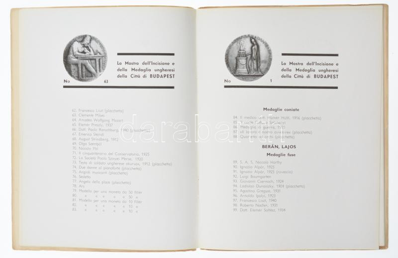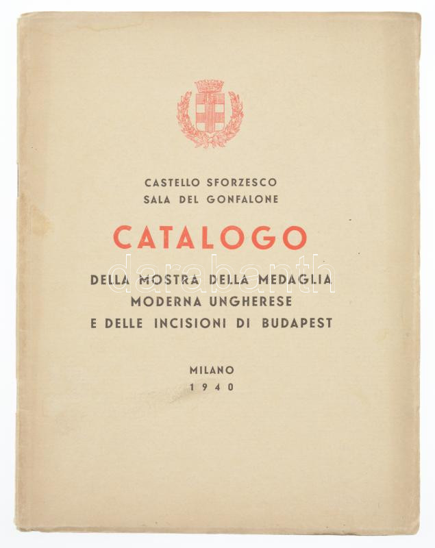 "Catalogo della mostra ella medaglia moderna Ungherese e delle incisioni di Budapest" az 1940-ben,a milánói Castello Sforzesco-ban megrendezett "Budapesti metszet és éremkiállítás" olasz nyelvű kiállítás katalógusa. Milánó, 1940. Használt, jó állapotban, a borítón kisebb foltok, pár lapon szövegkiemelős vonás / "Catalogo della mostra ella medaglia moderna Ungherese e delle incisioni di Budapest". The italian Catalog of the "Budapest Engraving and Medal Exhibition" held in 1940 in the Castello Sforzesco in Milan, Italy. Milan, 1940. Used, in good condition, small stains on the cover, text highlighting on a few pages.
