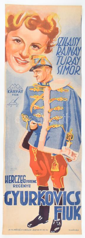 Gyurkovics fiúk , 1941. Moziplakát (filmplakát, rácsplakát). Turay Ida, Rajnay Gábor, Simor Erzsi, Szilassy László és mások szereplésével. Herczeg Ferenc regénye. Litográfia, papír. Kenyeres grafikája, jelzett a litográfián. Unitas Lito nyomda. Kárpát Film. Kováts Béla Filmreklám. Jó állapotban 84×28,5 cm. / Vintage Hungarian poster of a movie, in good condition, lithography on paper.