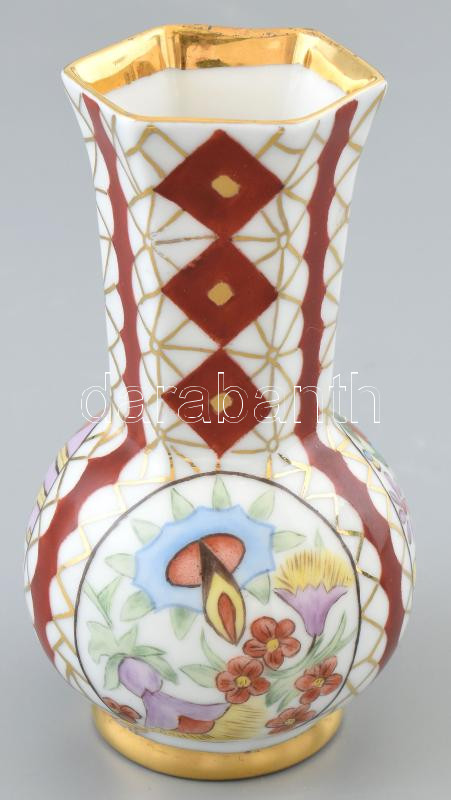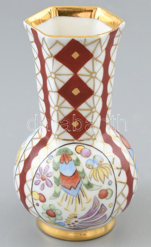 Leírás: Zsolnay art deco festésű váza. Kézzel festett, jelzett, Mällner M. 1937. Kevés kopással. 14 cm