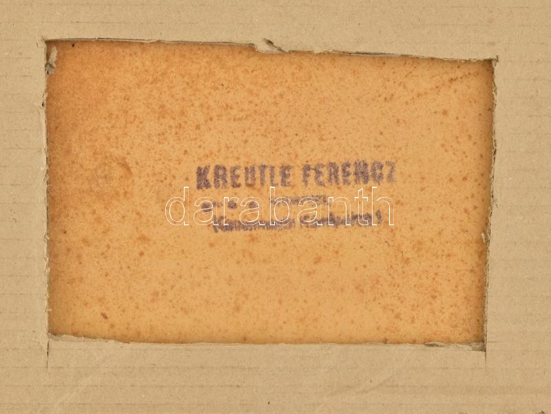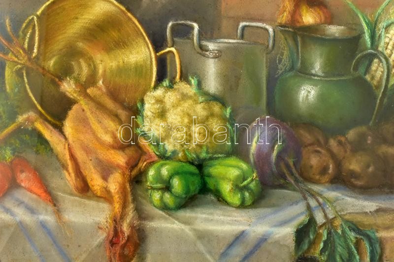 Jelzés nélkül, feltehetően a XX. sz. elején működött magyar festő alkotása: Csirkés csendélet. Pasztell, papír, lap széle sérült. Hátoldalán Kreutle Ferencz művészellátó pecsétjével. Üvegezett fa keretben. 56x66 cm