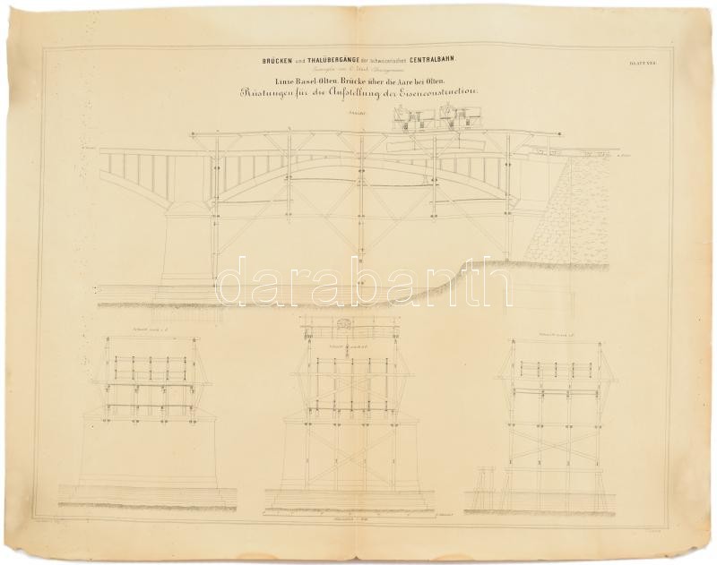 cca 1860-80 Svájci vasúti híd tervrajza (az Aare felett Olten helységénél). 1:100. Litográfia, papír. Hajtásnyommal, kissé foltos, lapszéli kisebb szakadásokkal. 49,5x64,5 cm