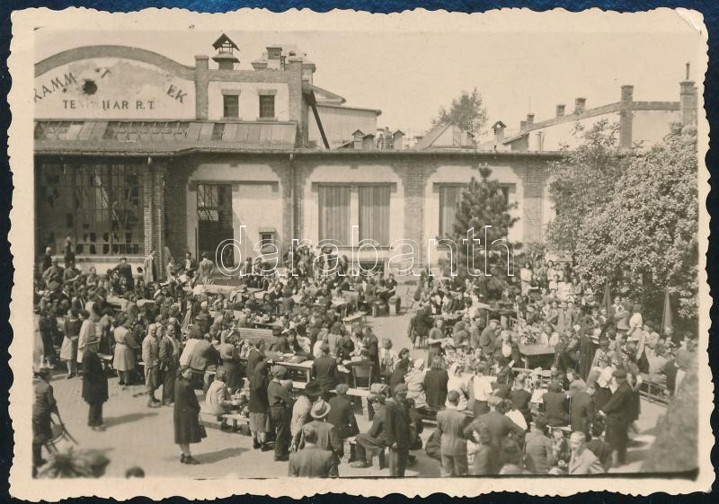 Leírás: 1945 Budapest, Kőbánya, Kammer Testvérek Textilipar Rt. épülete emberekkel, fotó, 6×9 cm