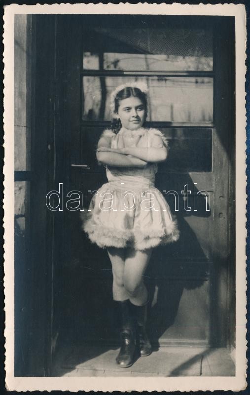 Leírás: 1949 Tollas ruhácskában, fotólap, feliratozva, 13,5×8,5 cm
