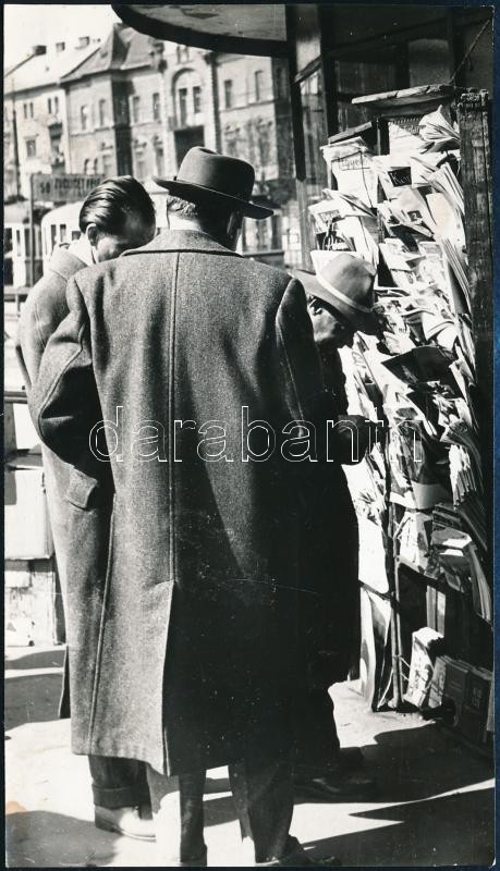 Leírás: 1959 Budapest, újságárus a Moszkva téren, hátoldalon feliratozott fotó, jó állapotban, 17,5×10 cm