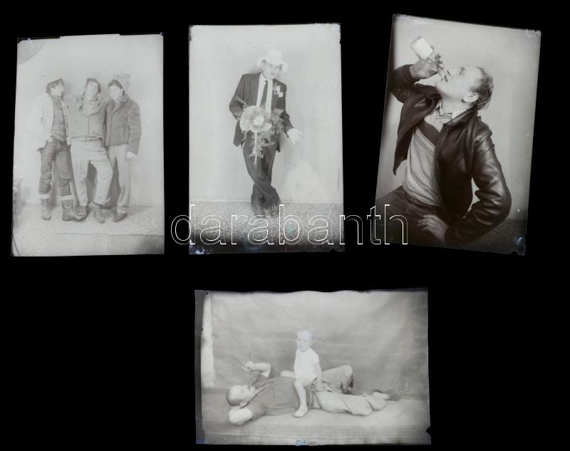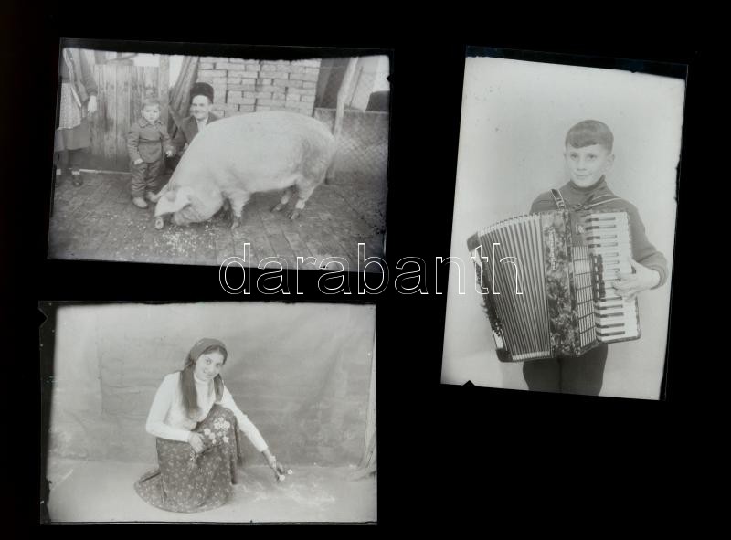 cca 1950 Csongrád, Hajdu János (?-?) csongrádi fényképész hagyatékából 13 db vintage NEGATÍV, különféle témákról (cigány viseletek, asztalos műhely, ravatal, ültetőgép, a gazda büszkeségei, piroskavárosi apacs legények, centivágó katona, ,,Kis Ibolyát" vegyenek, stb.), 15x10 cm-es síkfilmek