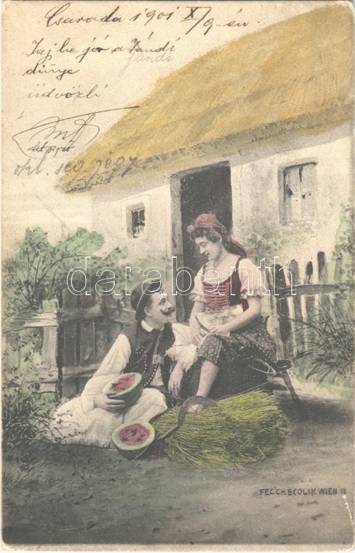 1901 Magyar folklór / Hungarian folklore, romantic couple. Fec. Ch. Sc... https://www.darabanth.com/hu/390-Gyorsarveres/390.0/Kepeslapok/Folklor~1500043/1901-Magyar-folklor-Hungarian-folklore-romantic-couple-Fec-Ch-Scolik-EK~II2352615