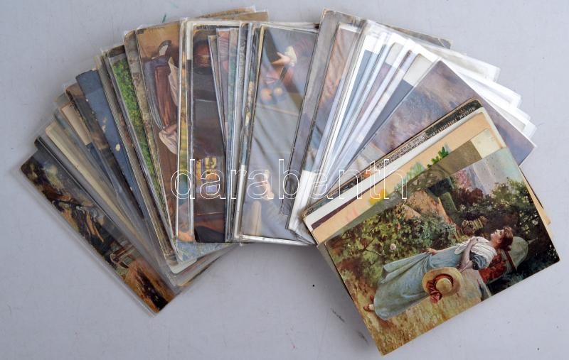 Leírás: 66 db régi képeslap főleg festmények, üdvözlők