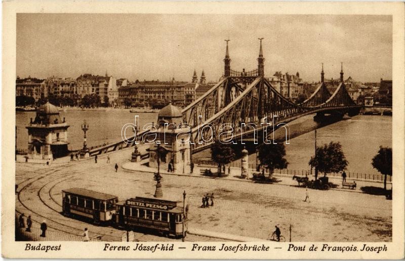 Budapest, Ferenc József híd, villamos Dietzl Pezsgő reklámmal https://www.darabanth.com/hu/390-Gyorsarveres/390.0/Kepeslapok/Magyarorszag~1500004/Budapest-Ferenc-Jozsef-hid-villamos-Dietzl-Pezsgo-reklammal~II2130067