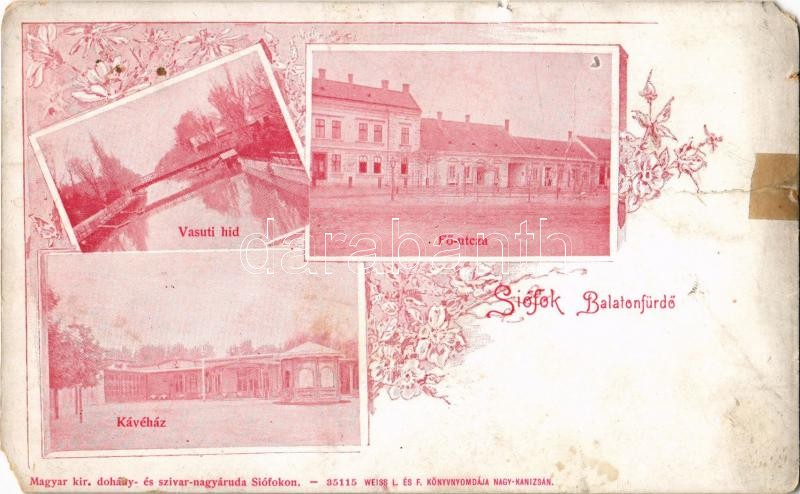 Siófok, Balatonfürdő, Vasúti híd, Kávéház, Fő utca. Weiss L. és F. Art... https://www.darabanth.com/hu/390-Gyorsarveres/390.0/Kepeslapok/Magyarorszag~1500004/Siofok-Balatonfurdo-Vasuti-hid-Kavehaz-Fo-utca-Weiss-L-es-F-Art-Nouveau-floral-b~II2129773