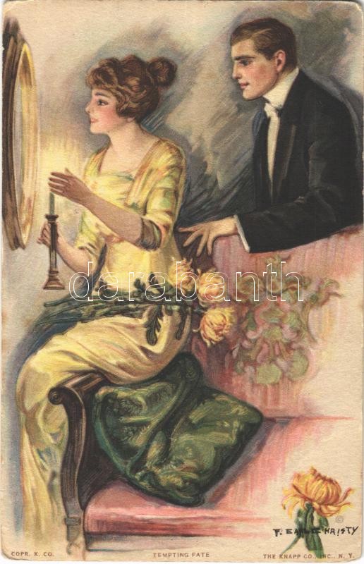 Leírás: 1919 "Tempting Fate" Lady art postcard, romantic couple. The Knapp Co. Inc. No. 319. s: T. Earl Christy (EB)