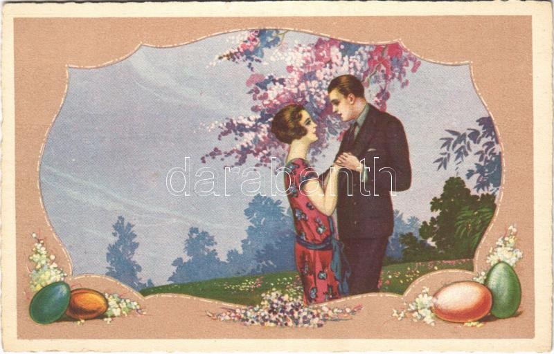 Leírás: Italian lady art postcard with Easter greeting, romantic couple with eggs. Degami 57. (apró szakadás / tiny tear)