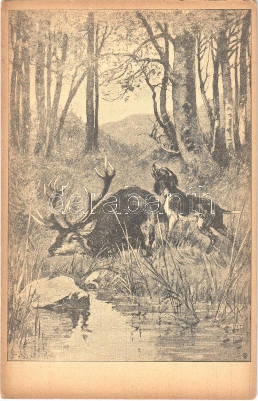 Hunter art postcard, hunting dog with stag https://www.darabanth.com/hu/390-Gyorsarveres/390.0/Kepeslapok/Vadasz~1500101/Hunter-art-postcard-hunting-dog-with-stag~II2351879