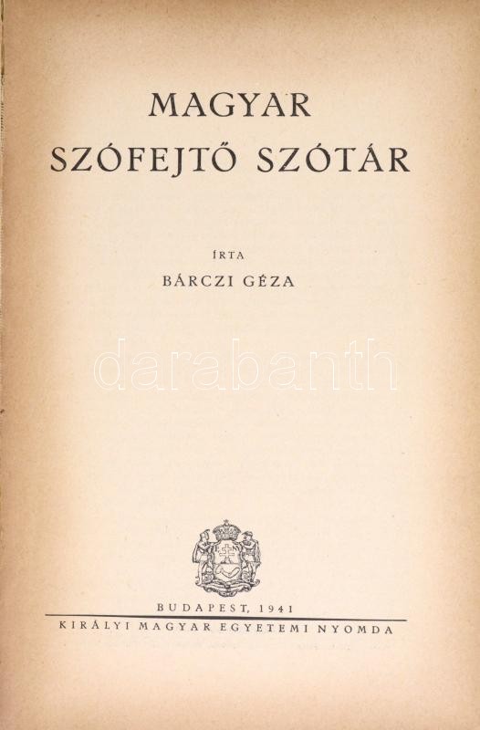 Bárczi Géza: Magyar szófejtő szótár. Bp., 1941, Kir. M. Egyetemi Nyomd... https://www.darabanth.com/hu/390-Gyorsarveres/390.0/Konyvek/Konyvek-Egyeb-ritkasagok~1000019/Barczi-Geza-Magyar-szofejto-szotar-Bp-1941-Kir-M-Egyetemi-Nyomda-348-p-plus-1-t-Kiadoi~II2351821
